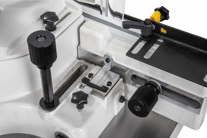 Основные базовые детали станка – тяжелый чугунный стол и фрезерный упор из алюминиевого литья. Теперь этот узел унифицирован с более дорогой моделью, он оснащен алюминиевыми, а не деревянными накладками и имеет прижимы-гребенки, дополняющие вертикальный упор. Увеличен диапазон перемещения упора по столу. Как и прежде, есть отдельная регулировка положения приемного (заднего) башмака.