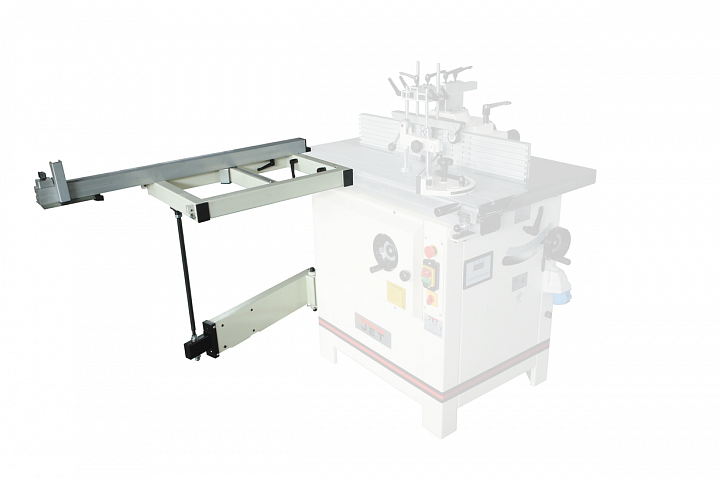 Jet JWS-2600 – современный универсальный фрезерный станок, оснащённый подвижным столом (кареткой), которая может быть укомплектована расширением с телескопической опорой. Подвижный стол выполнен из алюминиевого профиля и установлен с отступом от фрезы. В комплект поставки входит небольшой стальной расширитель каретки, упор заготовки с возможностью поворота и удобный эксцентриковый прижим. Устанавливаемый в качестве опции расширитель с телескопической опорой укомплектован более длинным упором, который также можно устанавливать под углом (есть и разметка в градусах).