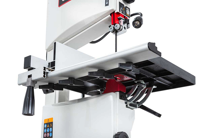 Базовая конструкция станка хорошо отработана, она используется давно при производстве многих схожих моделей и, в случае Jet JWBS-10SL, имеет ряд дополнительных эксклюзивных улучшений. Среди них рычаг для быстрого ослабления и натяжения полотна, позволяющий одним движением переводить станок из состояния хранения в рабочее. Хорошо продуманы и удобно реализованы некоторые «мелочи», вроде светодиодной подсветки или «ступенчатого» патрубка аспирации, позволяющего без всяких переделок подсоединить шланг любого из трех диаметров (50, 75 или 100 мм).