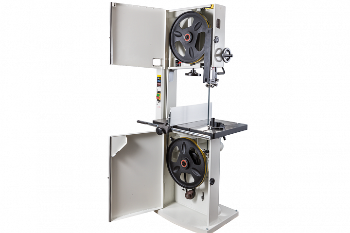 Механизм натяжения и центрирования ленты включает в себя две группы трехроликовых направляющих на шарикоподшипниках, стрелочный индикатор уровня натяжения, регулирующие маховики, два смотровых окошка и рычаг быстрого натяжения-ослабления. Он не совсем обычен, поскольку имеет не два, а три фиксированных положения: рабочее (плотно натянуто), для хранения (лента ослаблена, но держится на шкивах) и сервисное (для замены полотна). Чтобы улучшить плавность работы, использованы чугунные шкивы с массивным телом, а не в виде спицованных колес, как раньше.