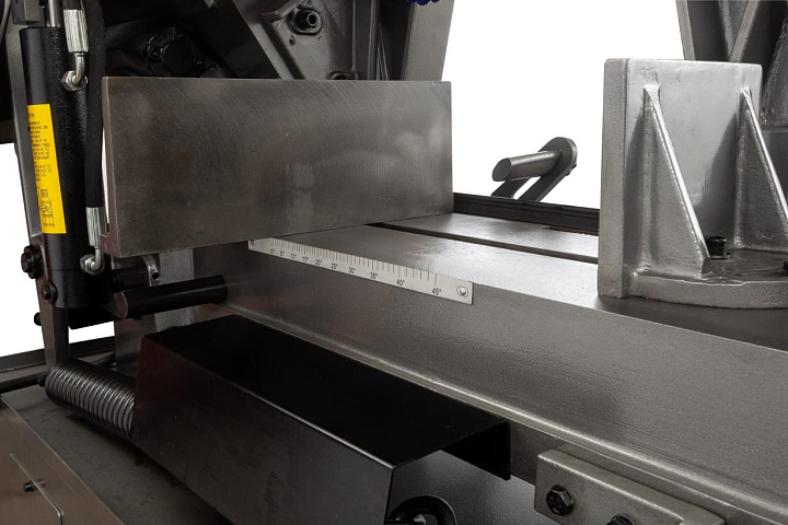 Процесс установки заготовок под нужным углом осуществляется за счет имеющихся механических тисков, оборудованных поворотными губками. Подъем и опускание тяжелой пильной рамы осуществляется за счет функционирования системы гидроразгрузки. С помощью гидроцилиндра можно осуществить регулировку скорости опускания консоли. Необходимое прижимное усилие рамы на обрабатываемую заготовку осуществляется за счет веса консоли.