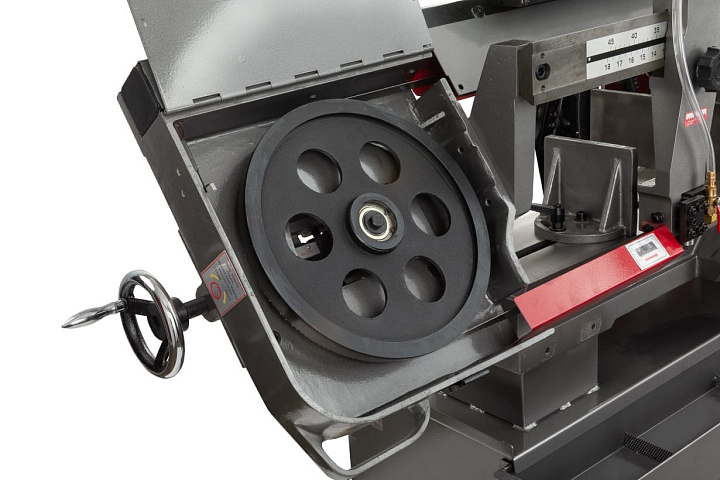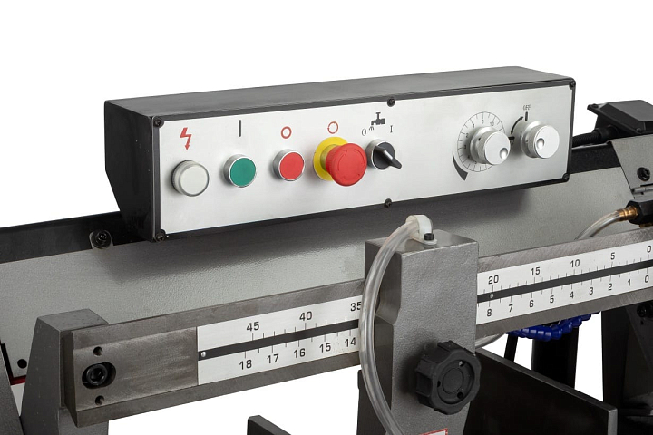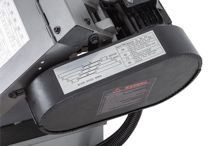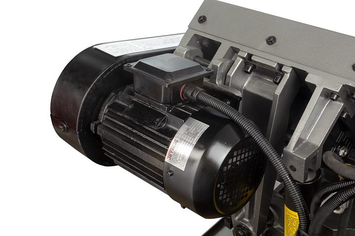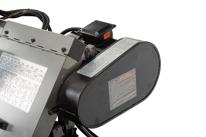 Моторная группа состоит из мощного электродвигателя - 1,5 кВт, обеспечивающего стабильную работу ленточного станка в различных скоростных режимах. Ременная передача позволяет осуществлять пиление заготовок на скоростях движения ленточного полотна в 29, 50, 73 и 95 м/мин. Управление работой станка осуществляется с пульта управления, установленного на консоли. Оборудование оснащено кнопкой аварийной остановки.