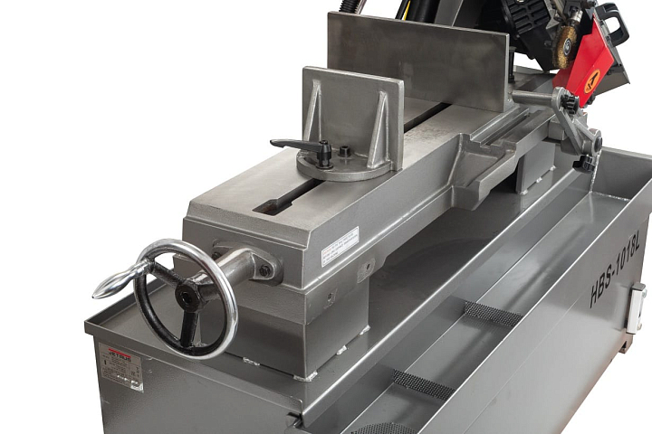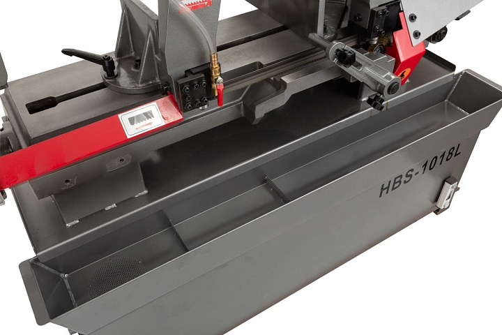 Модель HBS-1018L имеет регулируемые направляющие, предназначенные для прохода ленточного полотна в зависимости от формы заготовки и ее диаметра. Наличие направляющих предотвращает возникновение вибрации полотна, уход полотна в сторону. Направляющие укомплектованы блоком подшипников и твердосплавными сухарями, осуществляющими позиционирование полотна непосредственно под прямым углом к поверхности обрабатываемой заготовки. Качество пиления обеспечивается подачей СОЖ в зону резания. Сила натяжения полотна обеспечивается поворотом маховика, установленного в левой, торцевой части консоли. Ленточнопильный станок оборудован поддоном для сбора стружки и отработанной жидкости. Вес станка в полном снаряжении составляет 310 кг.