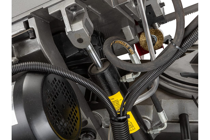 Моторная группа состоит из мощного электродвигателя - 1,5 кВт, обеспечивающего стабильную работу ленточного станка в различных скоростных режимах. Ременная передача позволяет осуществлять пиление заготовок на скоростях движения ленточного полотна в 29, 50, 73 и 95 м/мин. Управление работой станка осуществляется с пульта управления, установленного на консоли. Оборудование оснащено кнопкой аварийной остановки.