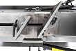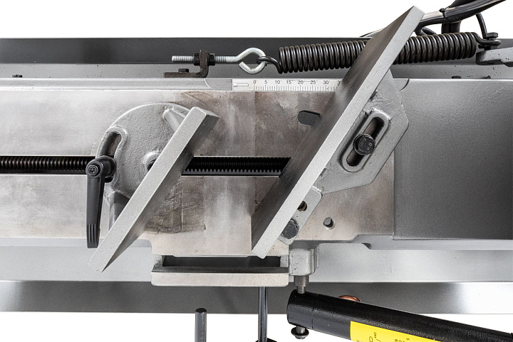 Процесс установки заготовок под нужным углом осуществляется за счет имеющихся механических тисков, оборудованных поворотными губками. Подъем и опускание тяжелой пильной рамы осуществляется за счет функционирования системы гидроразгрузки. С помощью гидроцилиндра можно осуществить регулировку скорости опускания консоли. Необходимое прижимное усилие рамы на обрабатываемую заготовку осуществляется за счет веса консоли.
