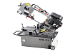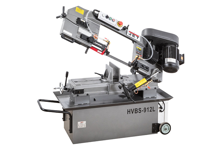 Модель HBS-912L имеет регулируемые направляющие, предназначенные для прохода ленточного полотна в зависимости от формы заготовки и ее диаметра. Наличие направляющих предотвращает возникновение вибрации полотна, уход полотна в сторону. Направляющие укомплектованы блоком подшипников и твердосплавными сухарями, осуществляющими позиционирование полотна непосредственно под прямым углом к поверхности обрабатываемой заготовки. Качество пиления обеспечивается подачей СОЖ в зону резания. Сила натяжения полотна обеспечивается поворотом маховика, установленного в левой, торцевой части консоли. Ленточнопильный станок оборудован поддоном для сбора стружки и отработанной жидкости. Вес станка в полном снаряжении составляет 190 кг.
