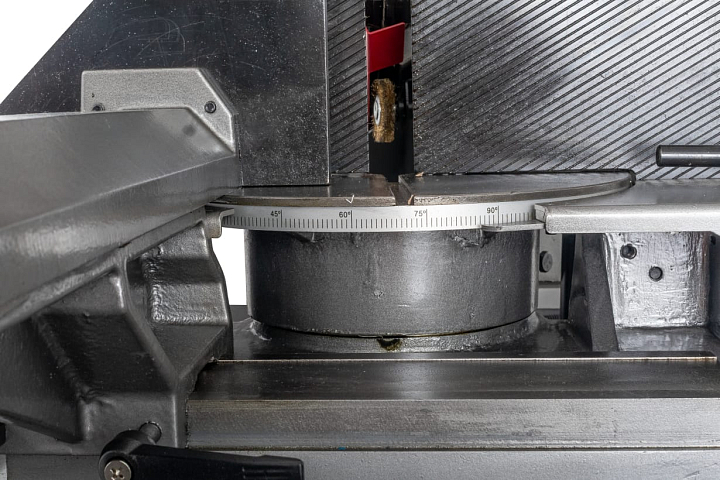 Особенность конструкции станка MBS-1012DASP заключается в возможностях осуществлять распил и прямоугольных заготовок, в том числе под углами -45°/+60°. Допускаемое сечение обрабатываемой заготовки при 90° составляет 315x190 мм, при пилении под углом -45°(влево) - 165x190мм, +45°(вправо) - 210x190мм. При повороте консоли на 60° в право – максимальный размер заготовки - 135x150мм.