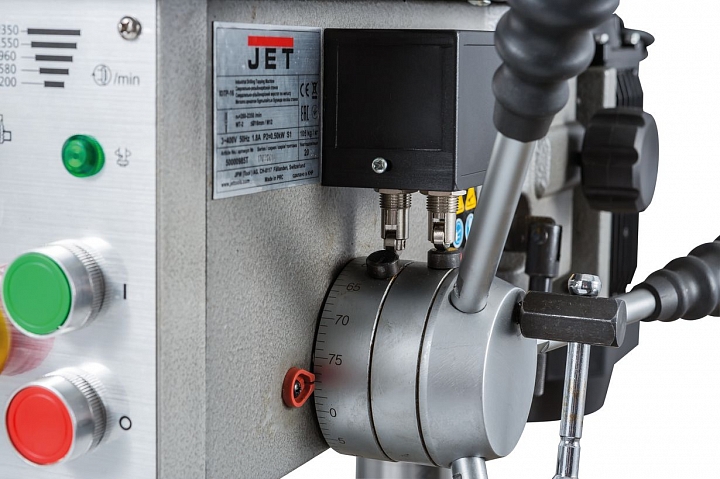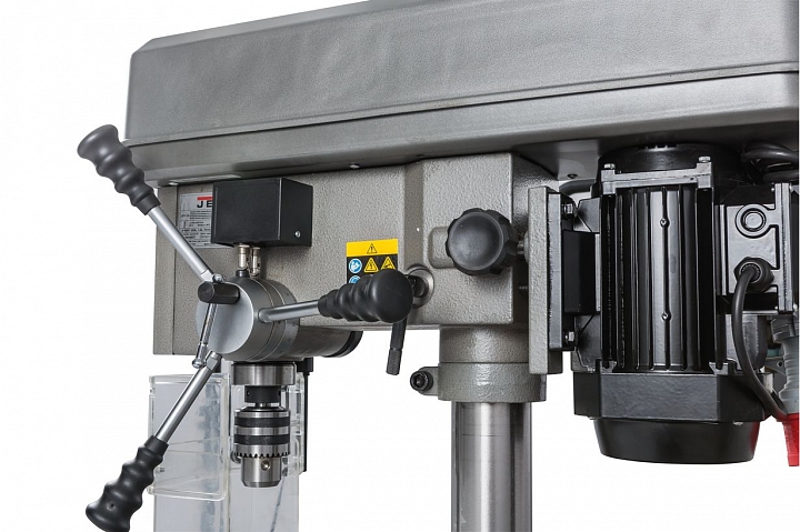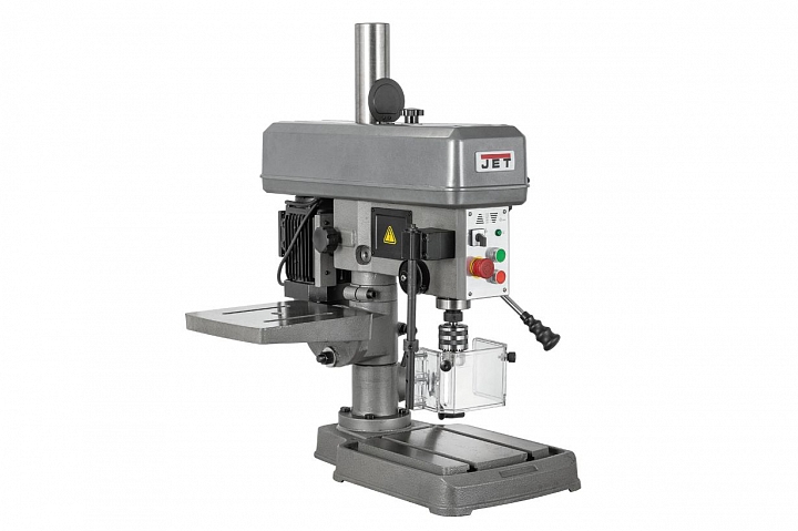 Станок сверлильный настольный IDTP-16 возглавил новую линейку станков JET с возможностью нарезать резьбу. Данный станок производится в Китае, что позволяет снизить стоимость изготовления, а это непосредственно влияет на цену станка в России. Станок оснащен мощным двигателем 500Вт и способен в режиме долгих нагрузок нарезать резьбу до М12. На станке установлен асинхронный двигатель, на который установлен шкив с 5-я ручьями, перекидывая ремень по ручьям шкива, вы меняете скорость от 200 до 2350 оборотов в минуту. Данное решение в тандеме с легкой натяжкой двигателя и надежной фиксацией, позволяет сохранить и передать хороший момент на шпинделе. Основание станка отлито из серого чугуна, станок устанавливается на верстак или стол, подстолье и фиксируется болтами. Надежная фиксация позволяет уменьшить вибрации. В основание вставляется толстостенная труба, на которую непосредственно крепится голова сверлильного станка. В управление станок достаточно прост.