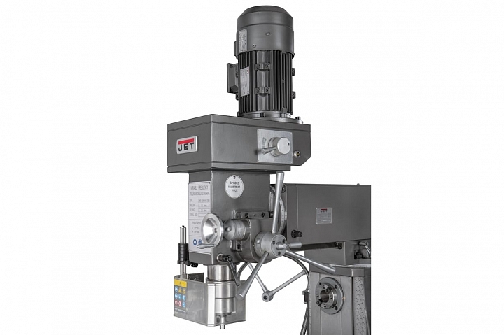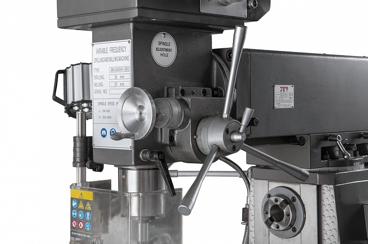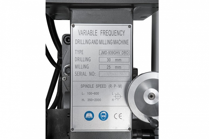 На станке JMD-939GHV DRO можно производить сверление отверстий до диаметра 30 мм и фрезеровать концевыми фрезами до диаметра 20 мм. На станке установлены вертикальный и горизонтальный шпиндели со скоростями вращения 100-2000 / 60-1350 об/мин соответственно. Расстояния между вертикальным шпинделем и столом от 70 до 370 мм, вертикальным шпинделем и поверхностью колонны от 250 до 650 мм; горизонтальный шпиндель-стол – от 20 до 320мм. Выбор скоростей вертикального шпинделя осуществляется с помощью бесступенчатой регулировки частоты вращения шпинделя с ее индикацией на пульте управления. Скорость вращения горизонтального шпинделя изменяется посредством клиноременных передач.