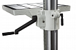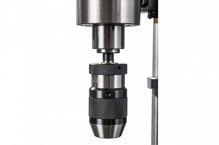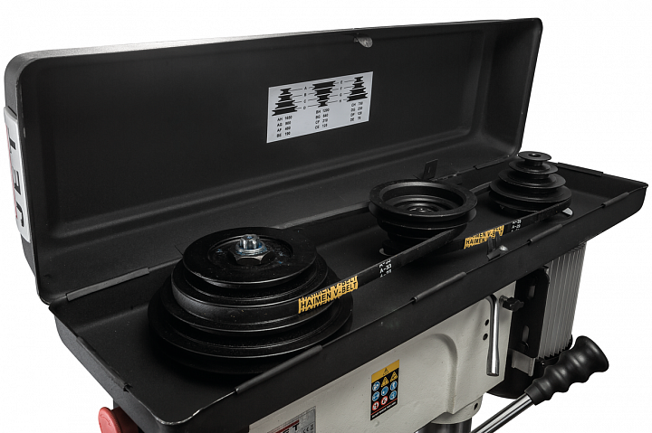 Шпиндель станка имеет конус МК-4, благодаря этому, ну и конечно двигателю мощностью 0,85кВт, станок способен сверлить отверстия в заготовках диаметром 32 мм. Не забывайте, что при этом на станке установлен асинхронный двигатель, подключается он к сети 380В и весь момент от двигателя передается через шкивы и ремни. Всего на станке 12 скоростей от 70 до 1650 об/мин. Обратите внимание именно 70 оборотов, это самая маленькая скорость в классе. Момент огромный и на маленьких оборотах сверлить, например, чугун можно до 35 мм.