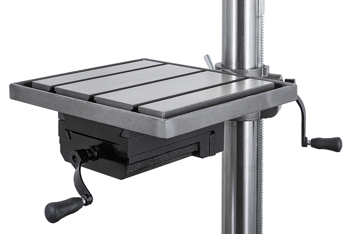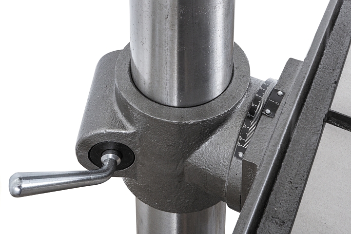 Стол имеет возможность поворота вокруг колонны на 360° и наклона вправо/влево по градуированной шкале на ±45°. Также может устанавливаться под углом в 90° для сверления в торце длинной заготовки. С другой стороны рабочего стола размещены встроенные тиски с шириной губок 210мм, расходом на 165мм и величиной перемещения вперед/назад на 165мм. Для упрощения размещения заготовки в тисках на станке встроен лазерный указатель, а для освещения рабочей зоны – светодиодная лампа местного освещения.